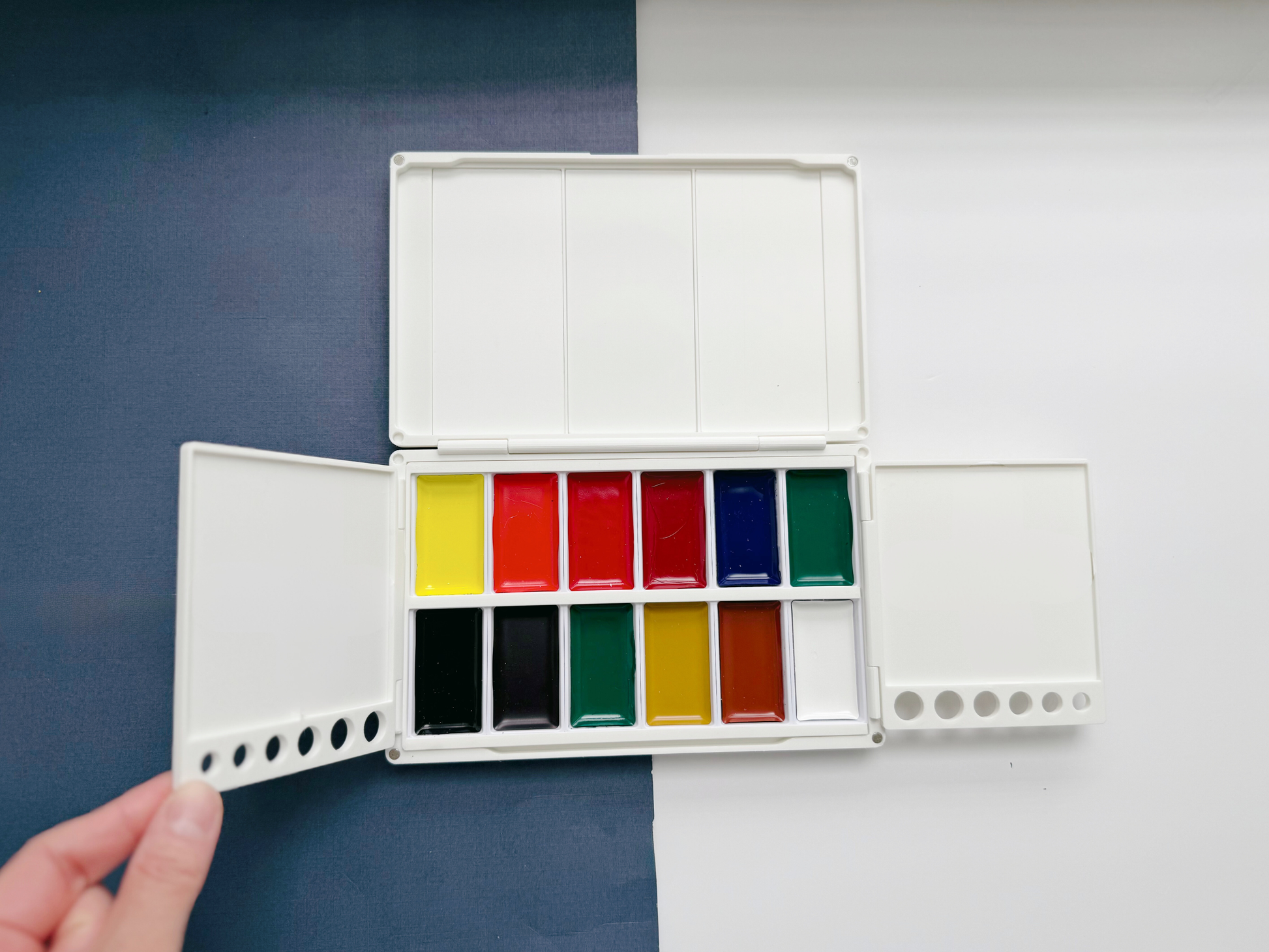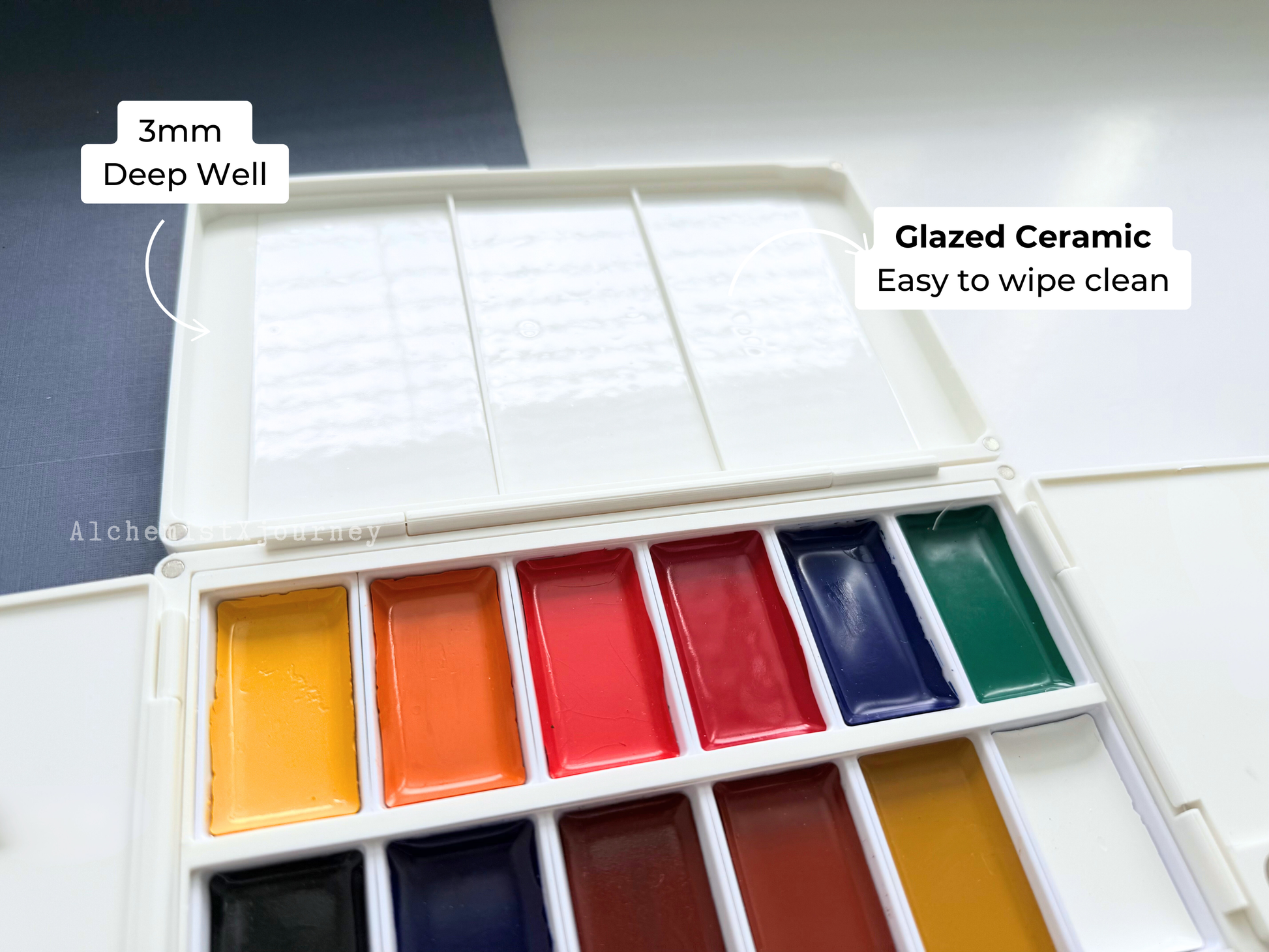 Upgraded to V2 with GLAZED ceramic mixing trays sealed with resin featuring 0.12in/3mm DEEP WELLS, ideal for artists who enjoy fluid, watery washes. The surface is ultra smooth, resists beading, and wipes clean effortlessly, even after your most colorful painting days.