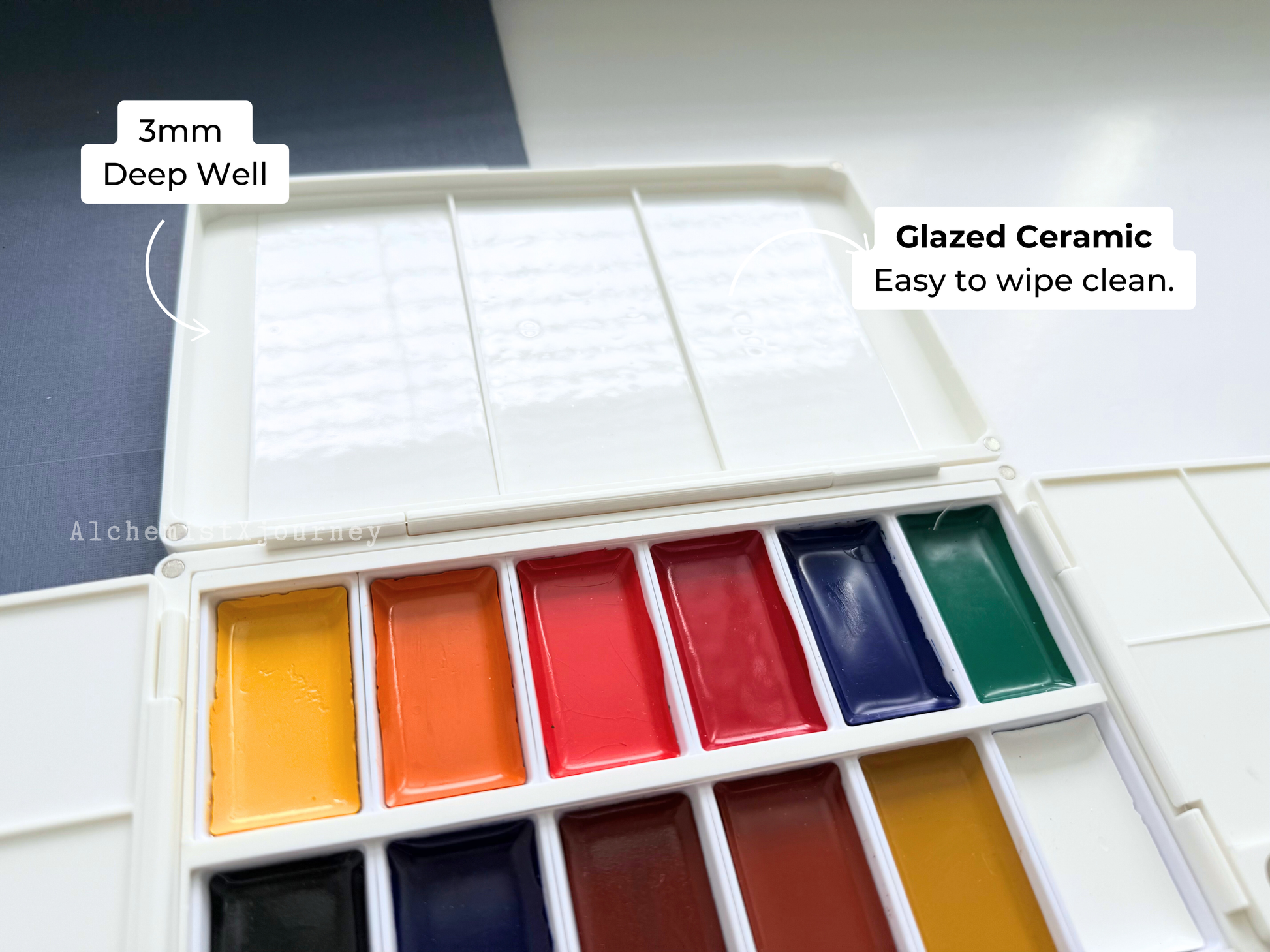 Upgraded to V2 with a glazed ceramic mixing tray featuring 3mm deep wells, ideal for artists who enjoy fluid, watery washes. The surface is ultra-smooth, resists beading, and wipes clean effortlessly, even after your most colorful painting days.